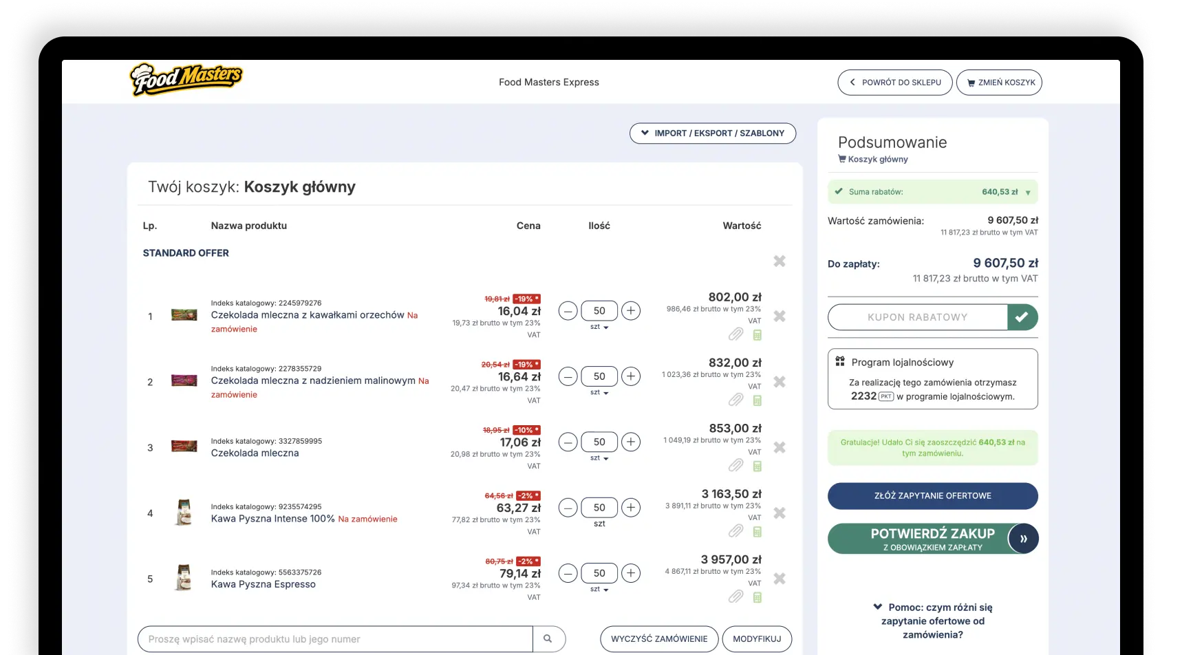 Przyspiesz składanie zamówień szablonami, szybkim koszykiem i importem z pliku.