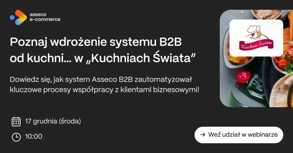 Serdecznie zapraszamy na bezpłatne webinarium, podczas którego Kuchnie Świata opowiedzą, jak dzięki systemowi Asseco e-Commerce Enterprise udało im się zautomatyzować kluczowe procesy współpracy z klientami.